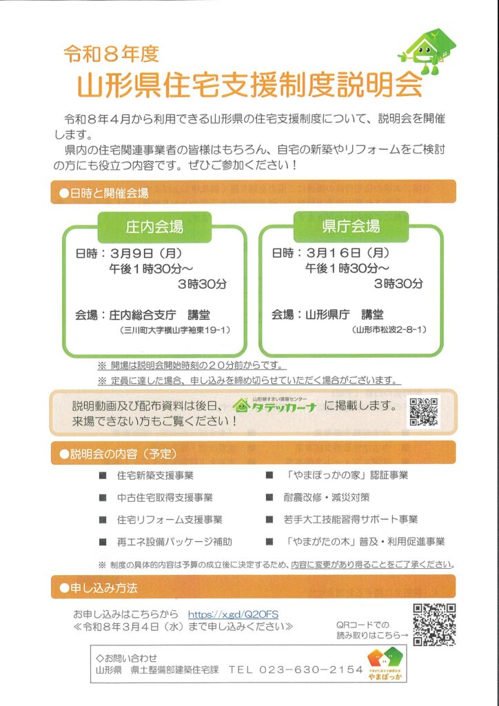令和8年度山形県住宅支援制度説明会 2026-02-05 最終更新日時 : 2026-02-05 北村山建設総合組合 令和8年4月から利用できる山形県の住宅支援制度について 説明会を開催します。以下のとおりです。